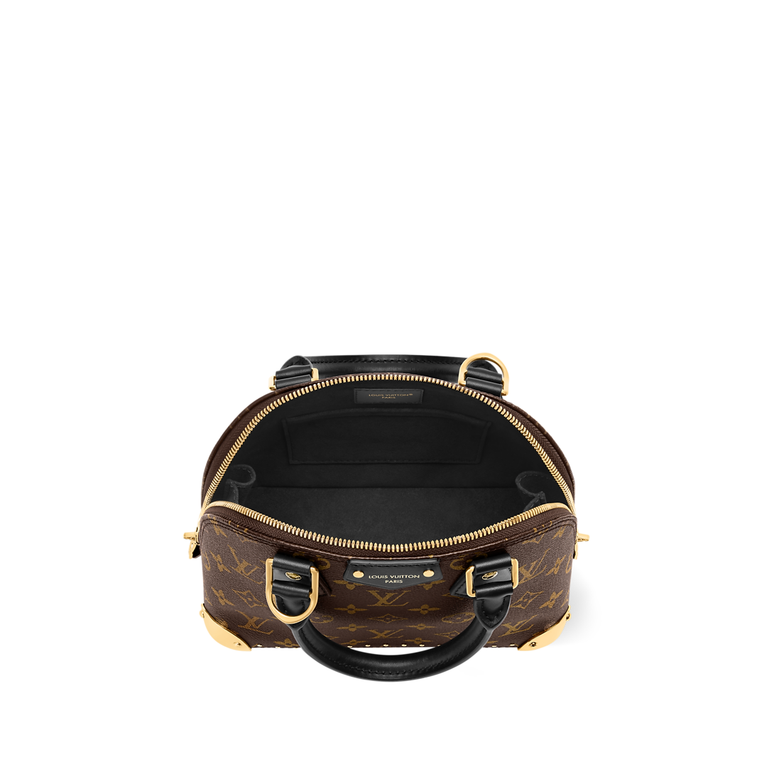The Alma BB is reimagined as part of the Trunk family, paying tribute to the House's travel heritage with iconic signatures. It is crafted from signature Monogram canvas, trimmed with black leather and gold-toned metallic corners and studs for an elevated finish. This edition is adorned with a removable chain and can be styled with or without the adjustable strap.