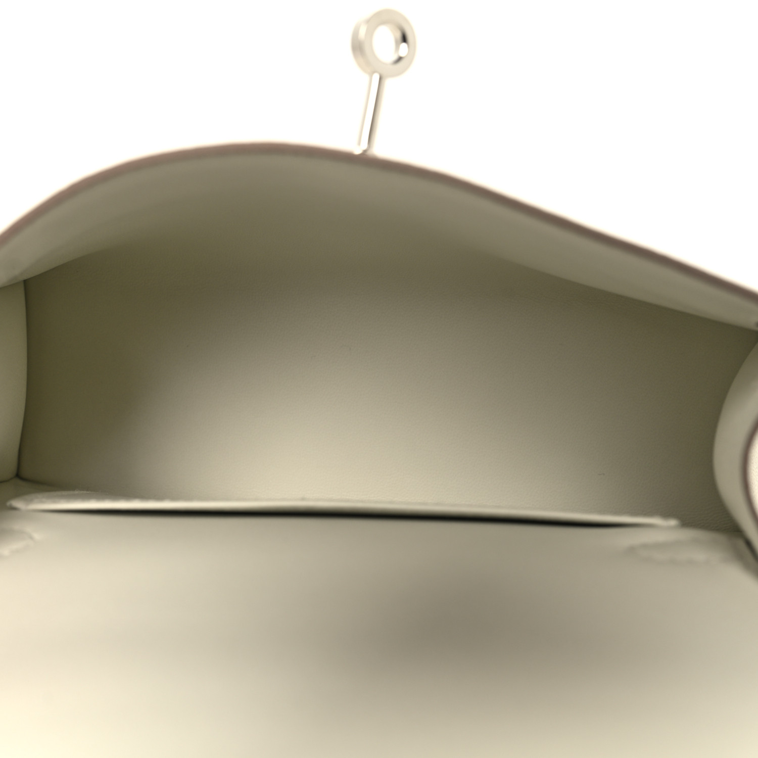 This is an authentic HERMES Chevre Mysore Mini Kelly Sellier 20 in Mushroom. This handbag is crafted in stamped Chevre Mysore goatskin leather in white. A single rolled leather top handle is secured with palladium hardware, and an optional leather shoulder strap is included. The traditional Kelly turn lock secures the small flap. The interior features lambskin leather with a single flat pocket.