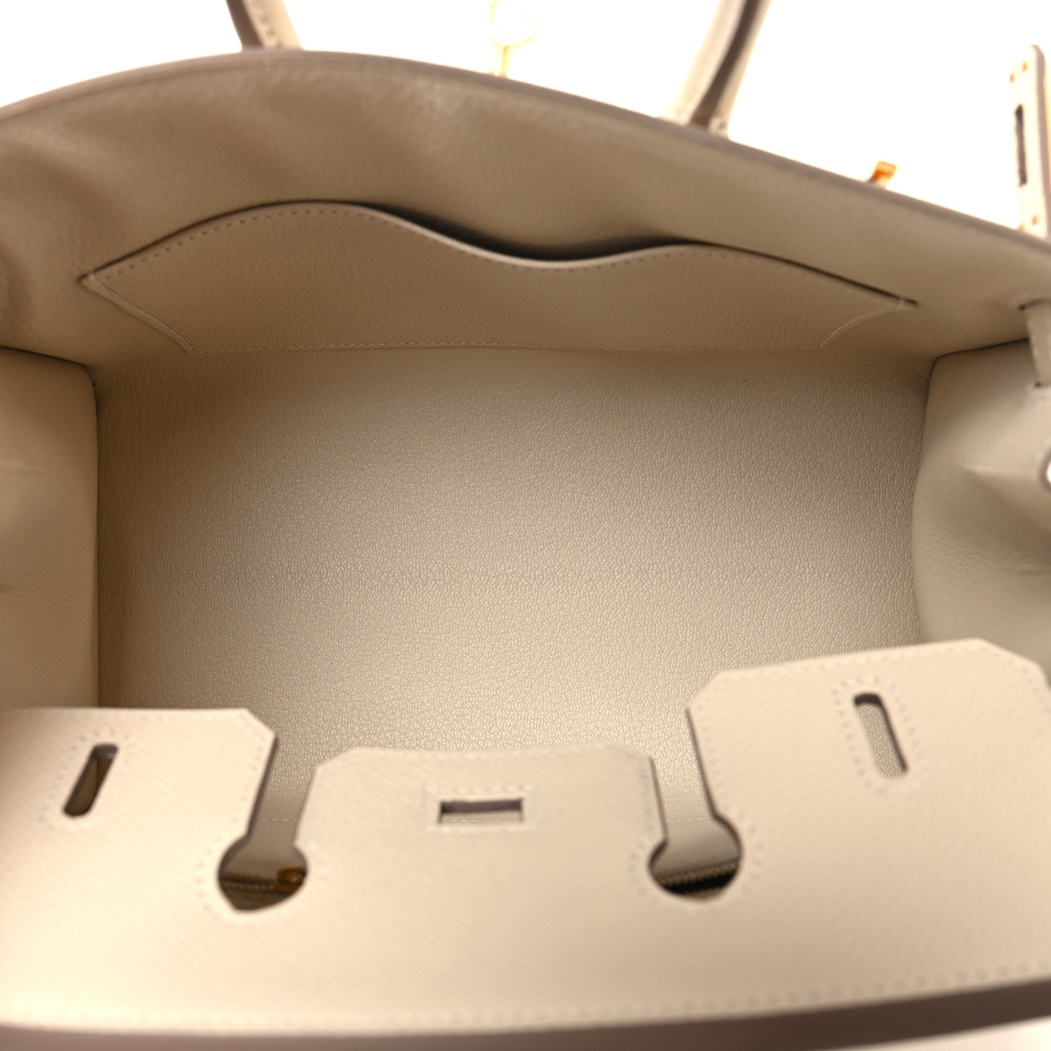 This is an authentic HERMES Epsom Birkin Sellier 25 in Craie. This rare Sellier model is expertly constructed of epsom calfskin leather in off white. This bag features rolled leather top handles, a front flap, strap closure and gold-plated hardware including a gold turn lock, a padlock, and two keys inside a clochette. This flap to a matching chevre goatskin leather interior with zipper and patch pockets.