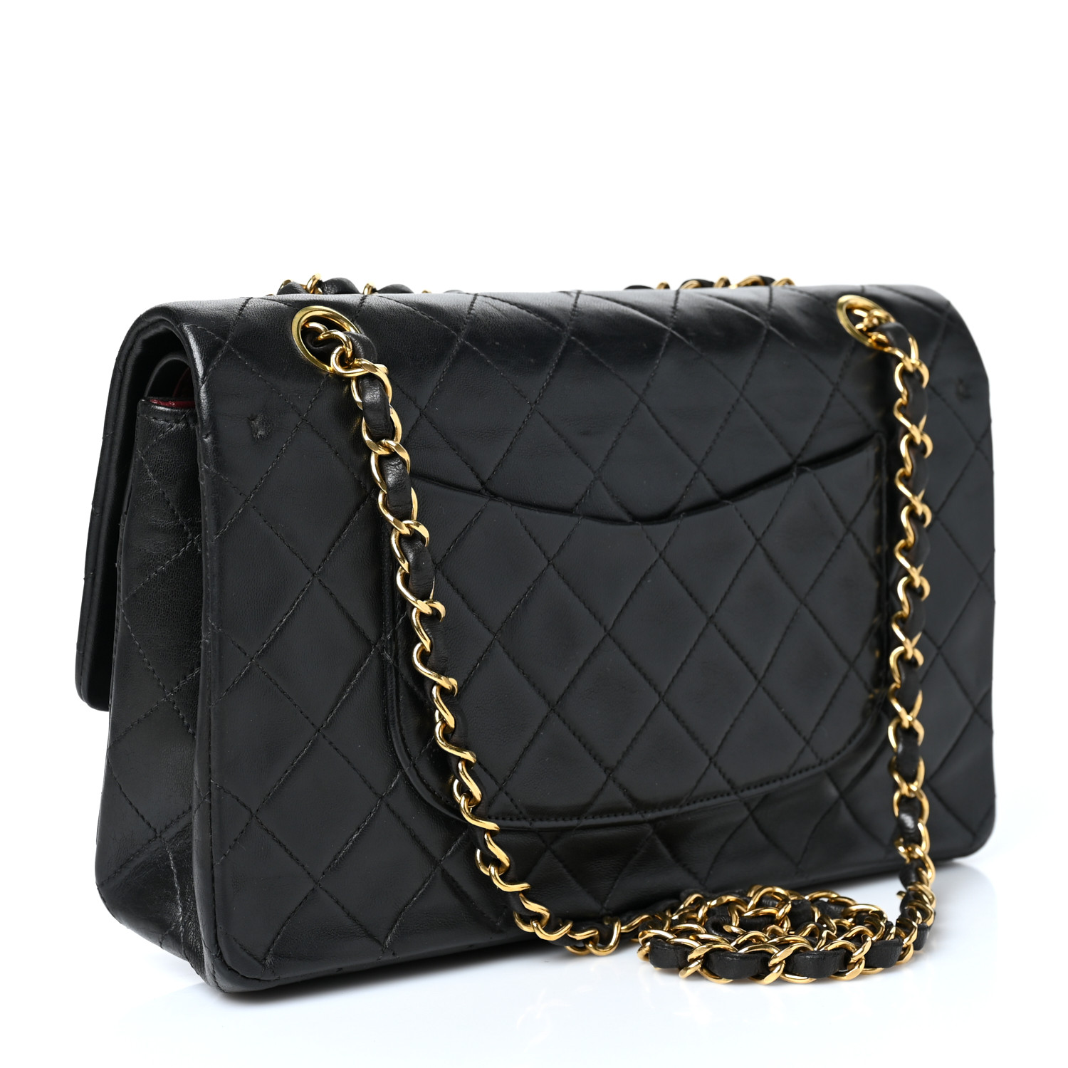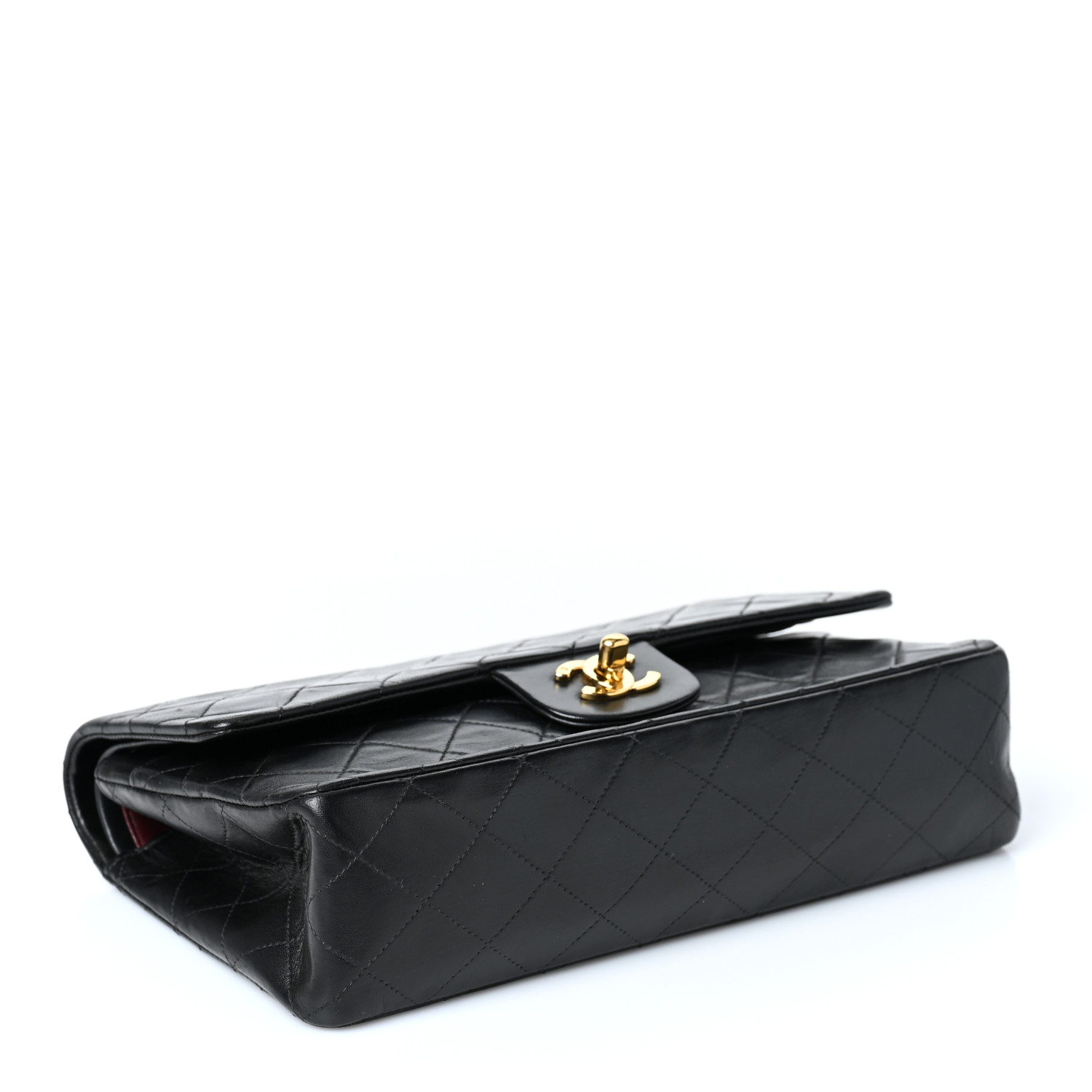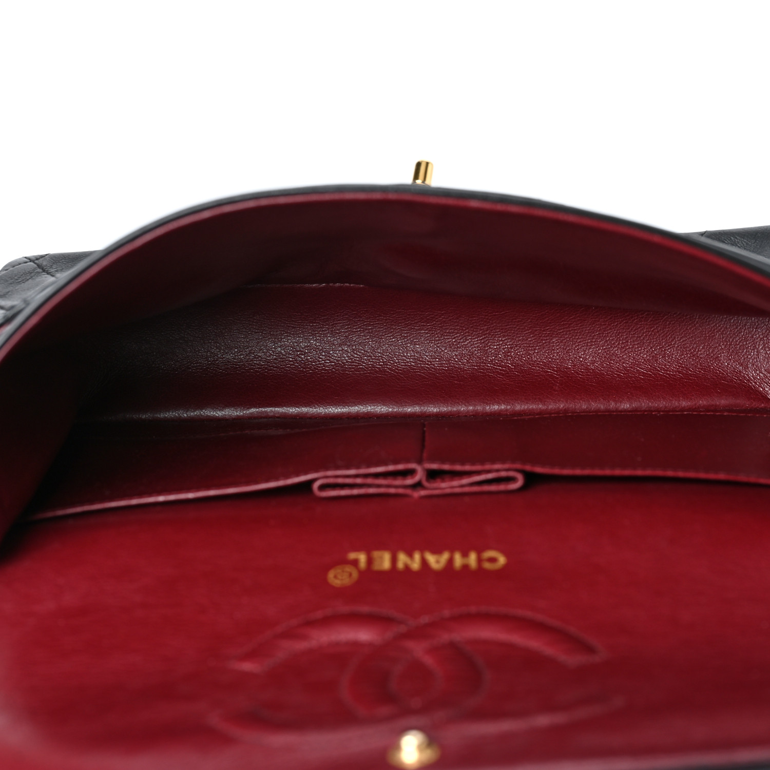 This is an authentic CHANEL Lambskin Quilted Medium Double Flap in Black. This classic style is beautifully crafted of soft black diamond quilted lambskin leather. This bag features a chain link shoulder straps threaded with black leather, an exterior flat pocket, and a front flap with a gold plated CC turn lock. This shoulder bag opens to an interior of burgundy leather with a stitched CC logo with patch pockets.