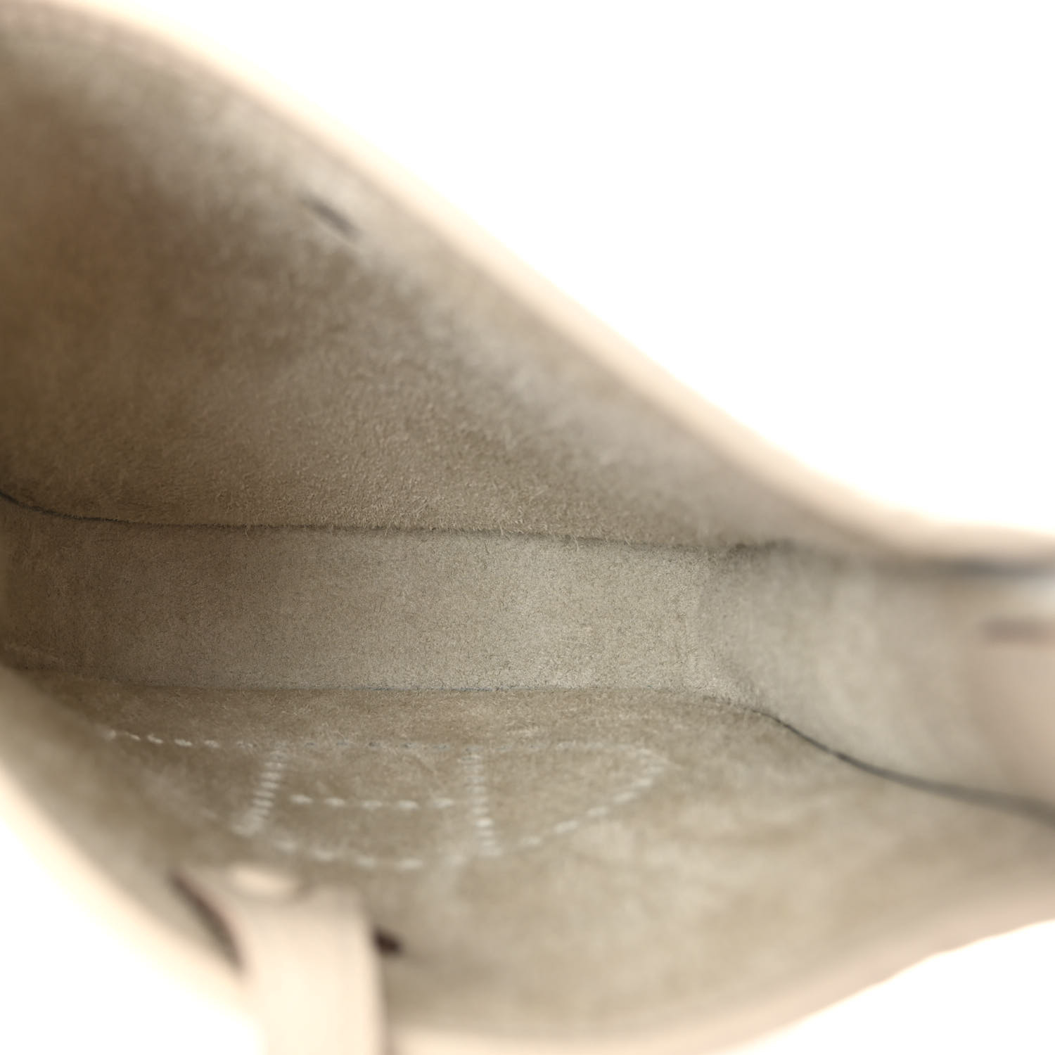 This is an authentic HERMES Taurillon Clemence Amazone Evelyne TPM in Beton. This small messenger bag is crafted of rich taurillon clemence calfskin leather in off white. The bag features a canvas body strap, polished palladium hardware, and a perforated Hermes H oval logo. The top of the bag opens with a crossover strap to a suede interior.
