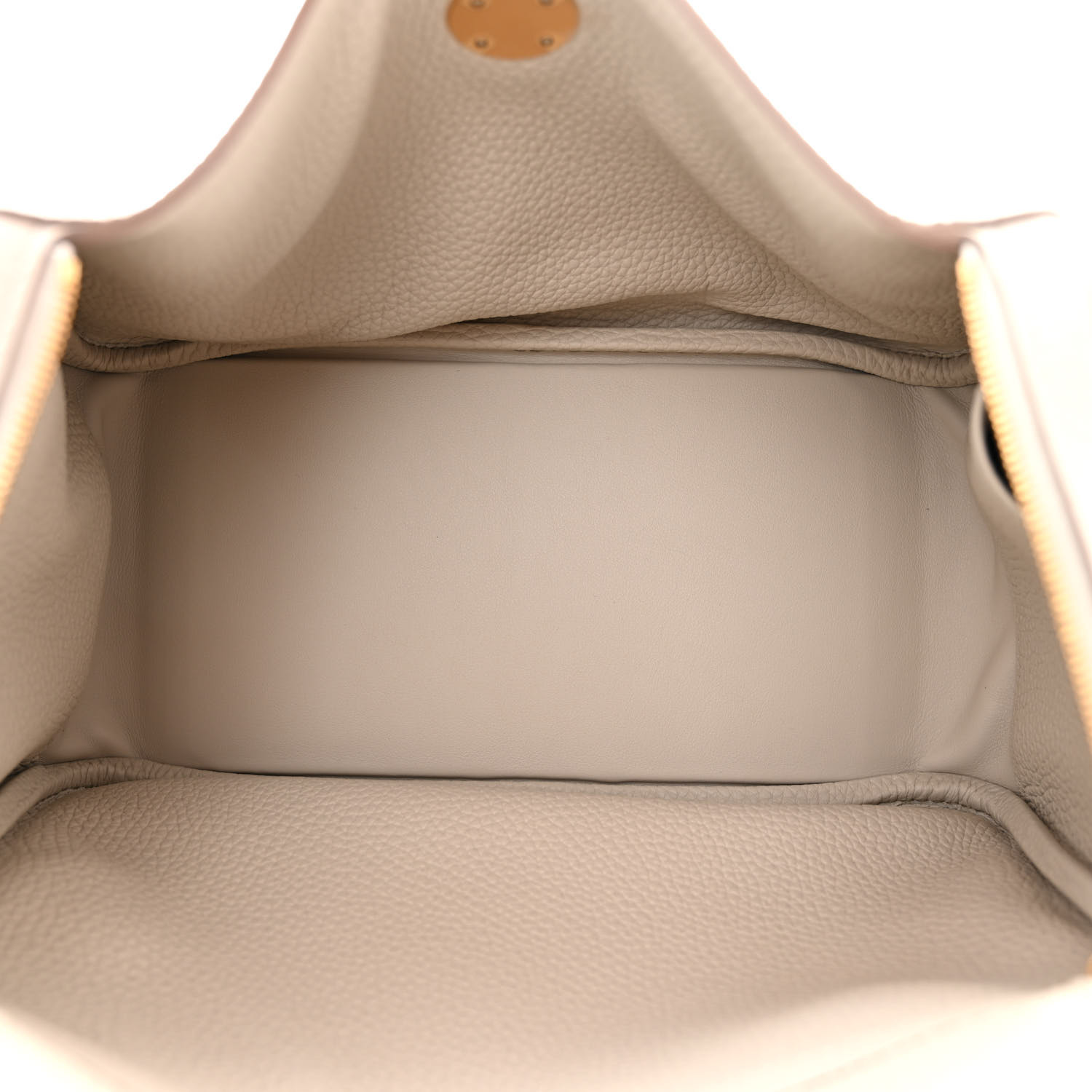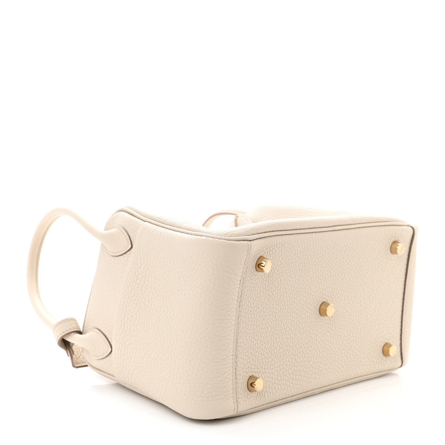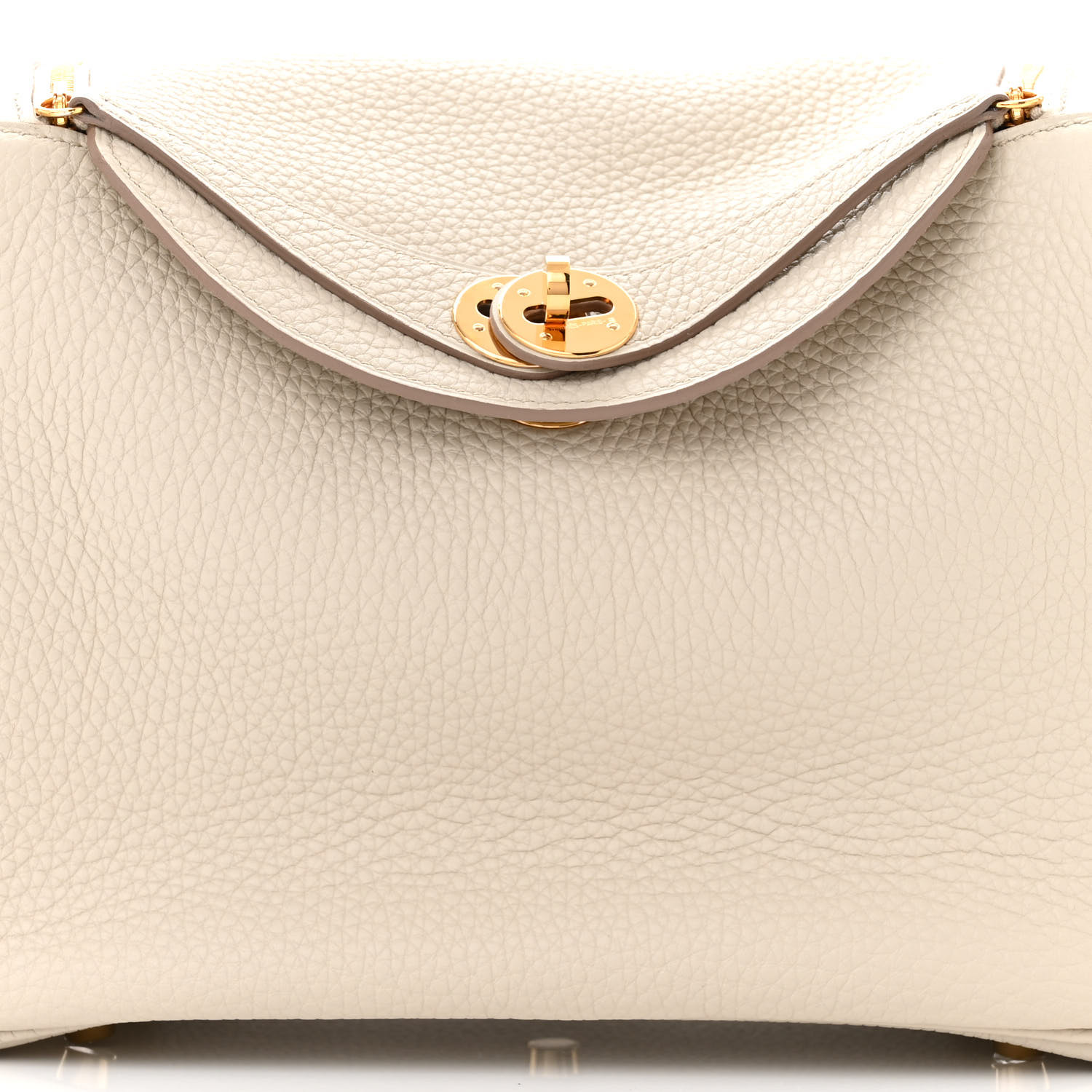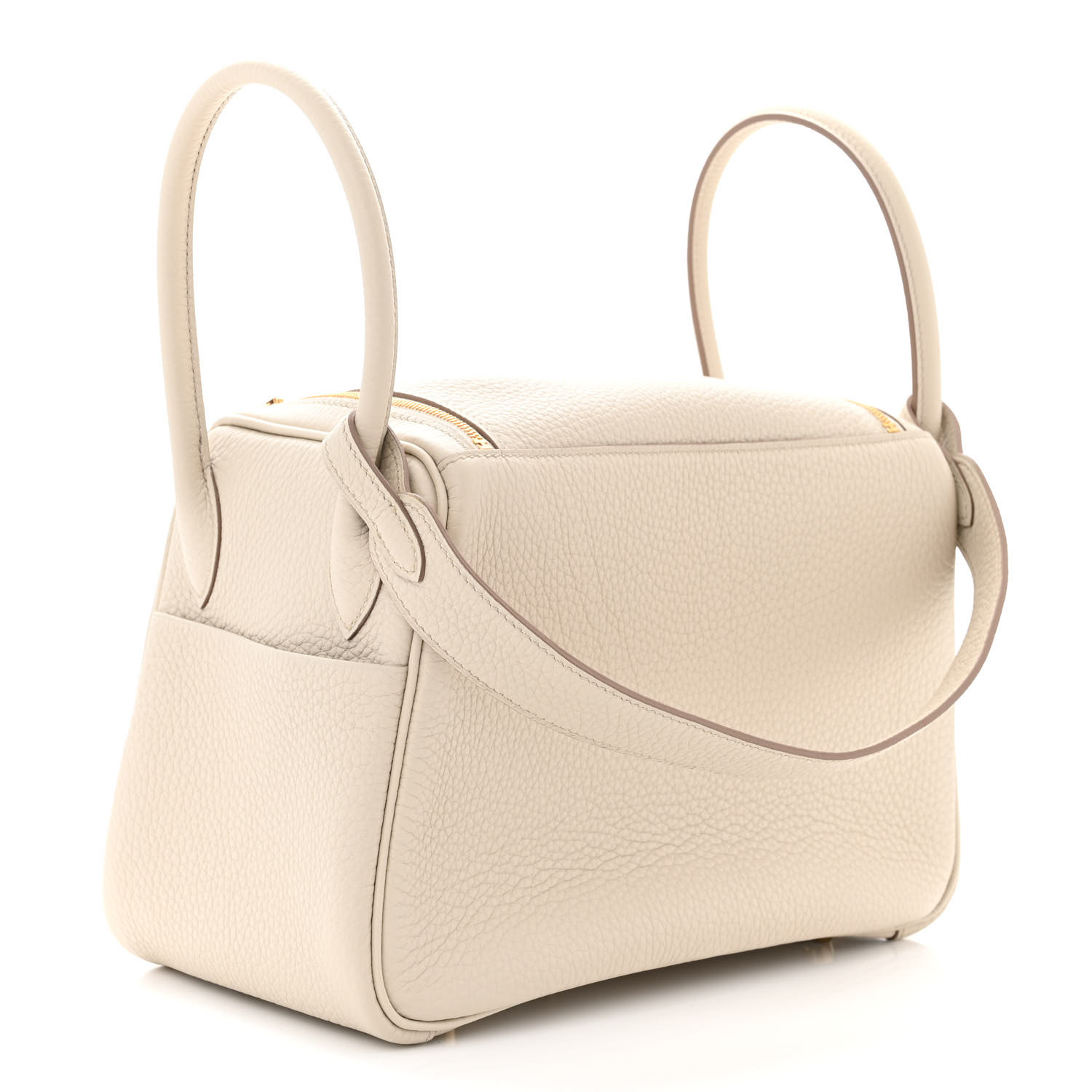 This is an authentic HERMES Taurillon Clemence Lindy 26 in Craie. This bag is crafted of luxurious taurillion clemence calfskin leather in white. It features frontward-facing rolled leather top handles on either side, a looping leather shoulder strap, a cross-over top flap, and a polished gold plated turn-lock closure. This bag opens to a matching leather interior with patch pockets.