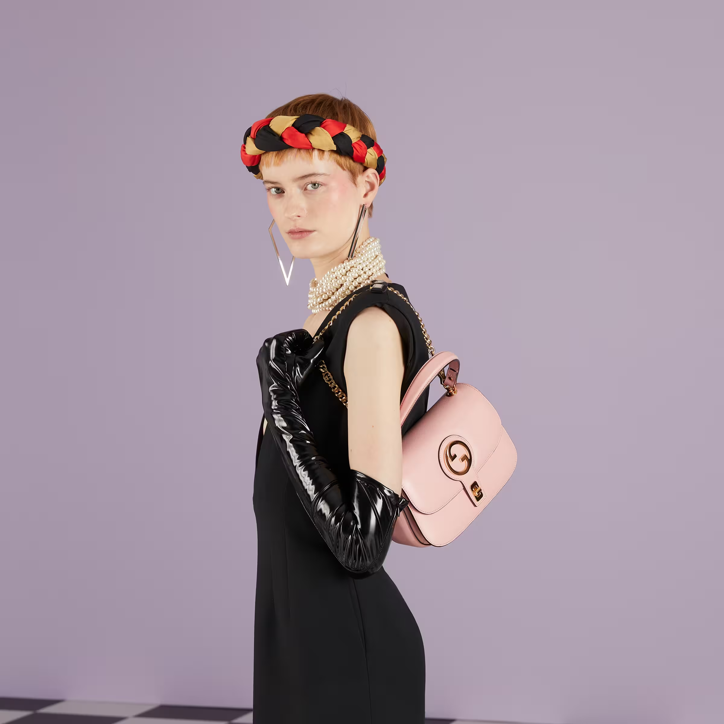 Vintage elements are paired with archival details across this small top-handle bag. The gold-toned hardware adds a defined vintage feel to the style, enriching the design with a timeless feel. The light pink leather mini bag is completed by two interchangeable shoulder straps, in tonal leather or gold-toned metal chain.