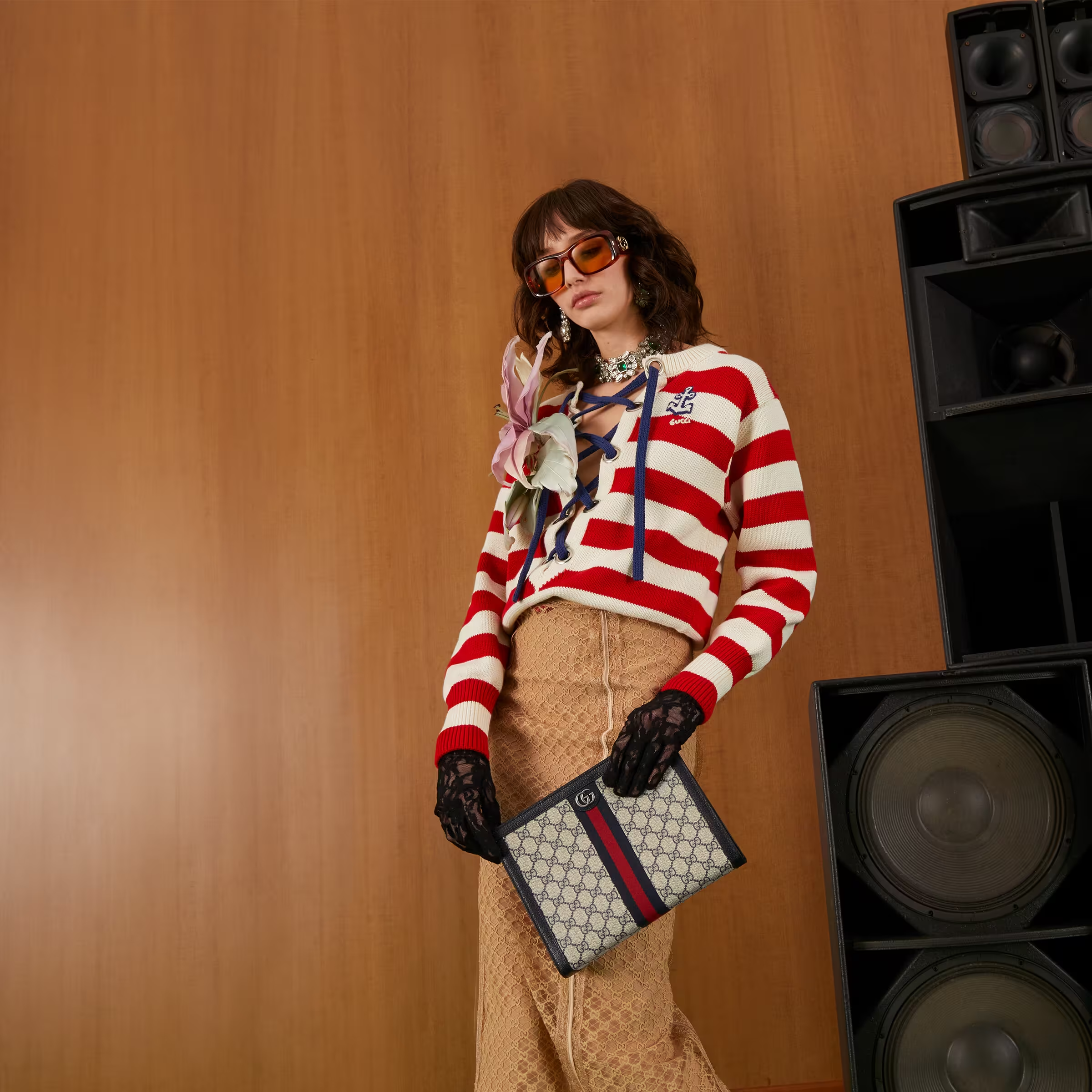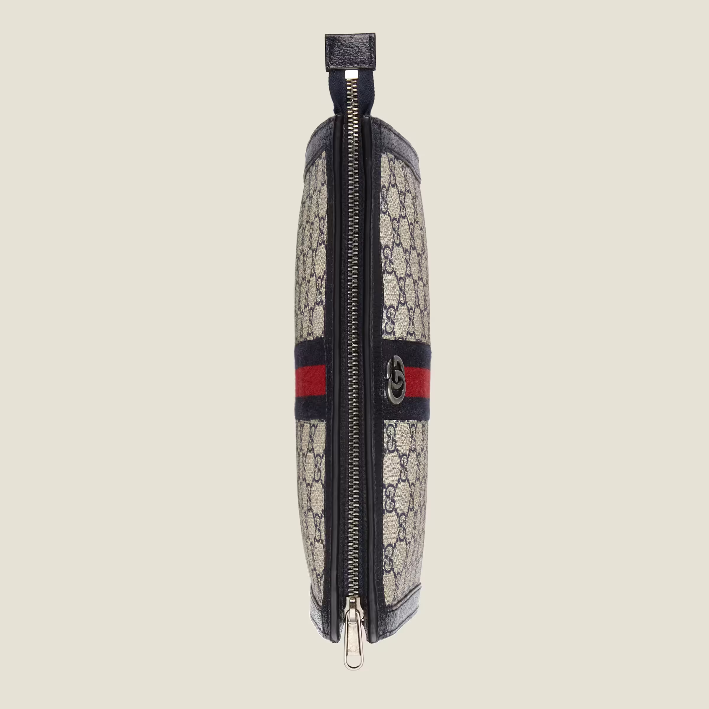 Mirroring the material's historic origins, GG Supreme is introduced in a timeless mix of blue and beige for Gucci Love Parade. The canvas has come to the front of each collection decade after decade to become a hallmark of the House. Here, the classic palette defines this slim Ophidia pouch.