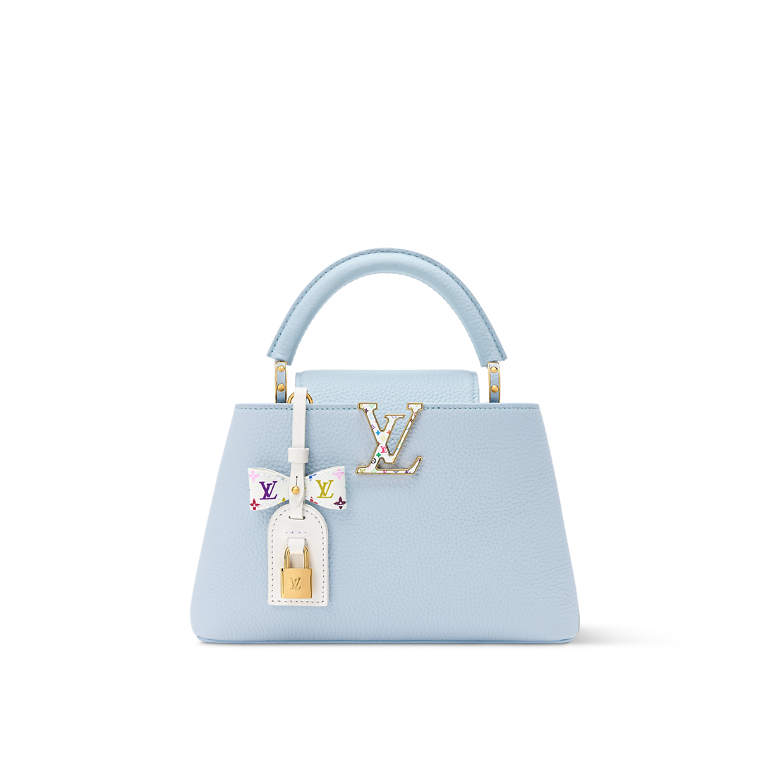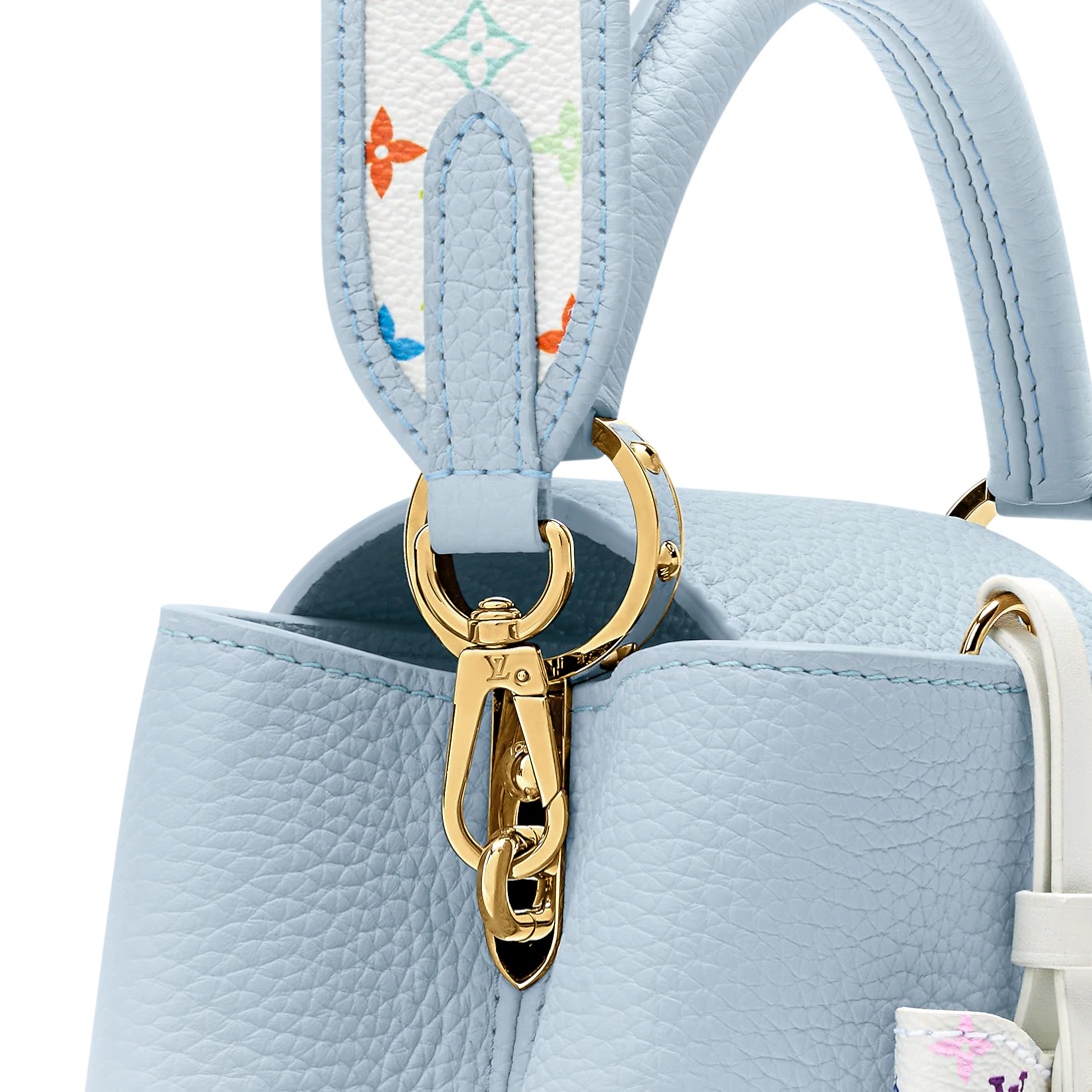 This elegant Capucines BB is updated for the House's exclusive anniversary collection, celebrating 130 years of the Louis Vuitton Monogram. Designed in collaboration with Takashi Murakami, this playful edition is offered in Olympian Blue Taurillon leather accented with multicolor Monogram trims, including a bow-shaped keybell. The signature gold-toned padlock lends a sophisticated finish.