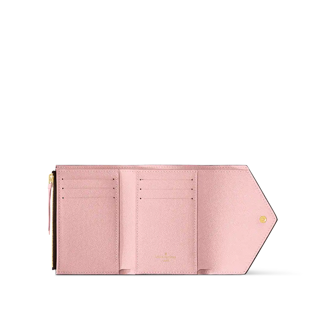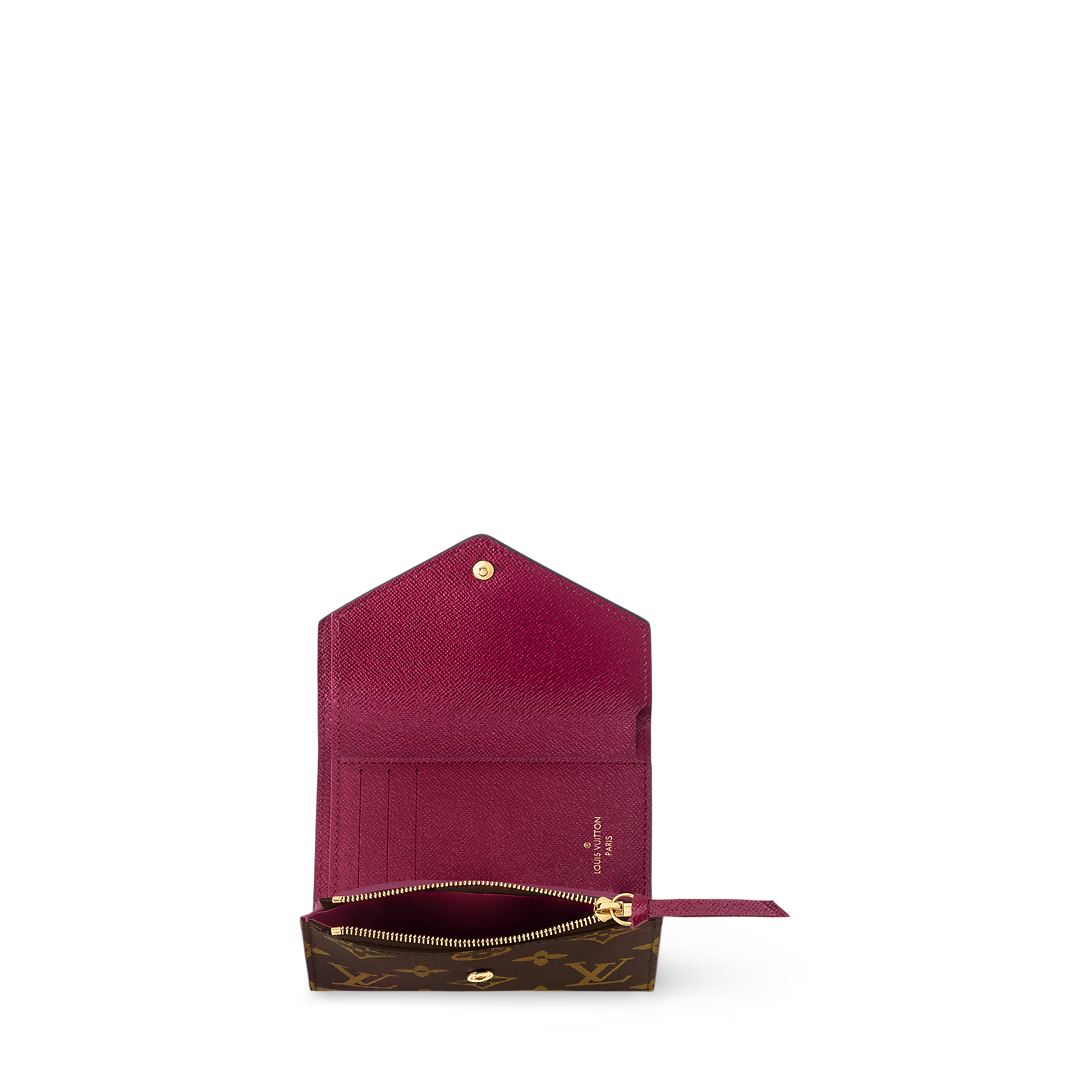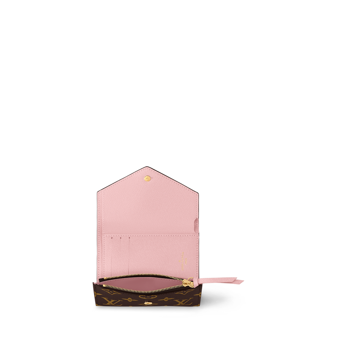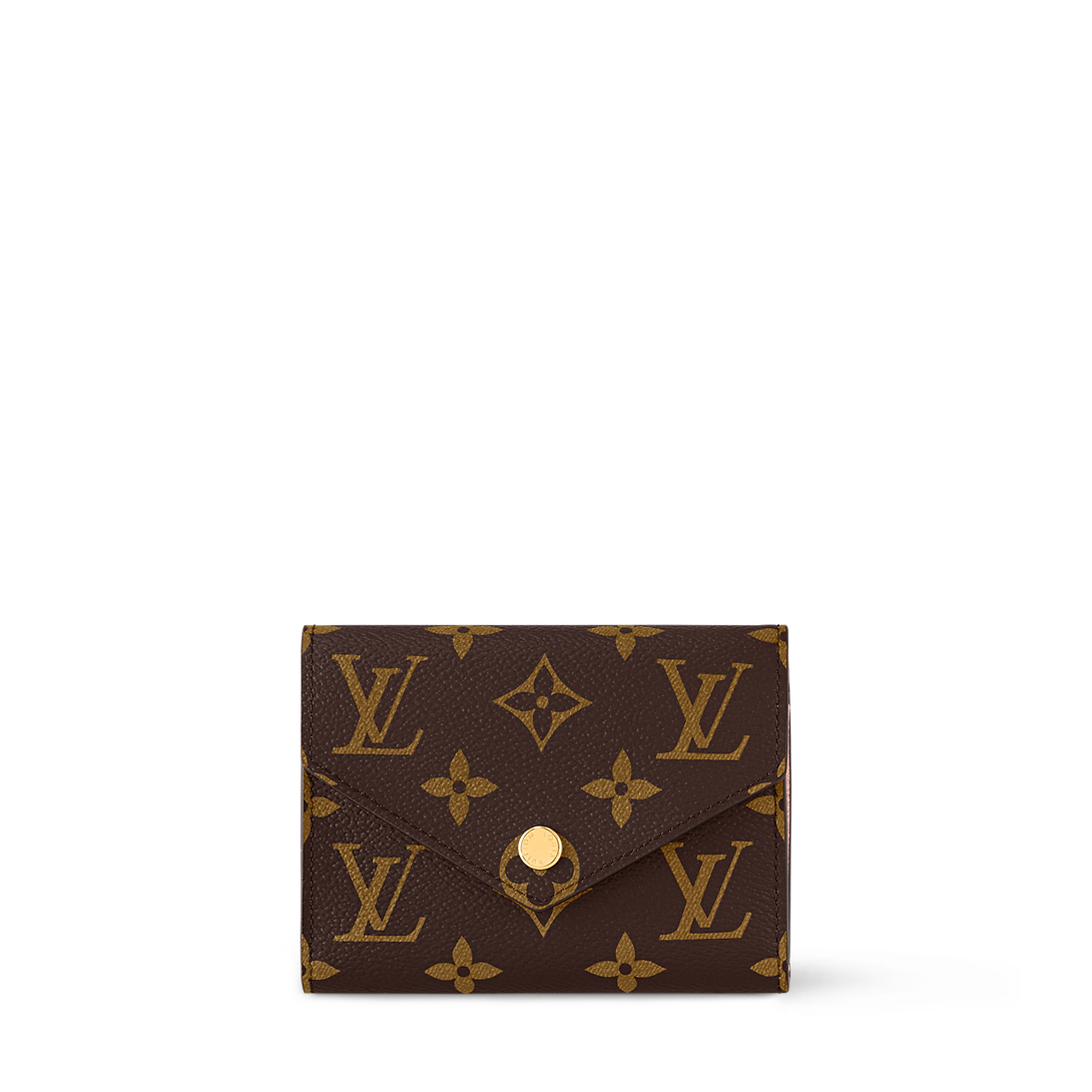 The compact Victorine wallet in Monogram canvas combines femininity and functionality. It opens out to reveal many practical features, including card slots and pockets for bills and coins. Its envelope-style flap is sealed with a press-stud.